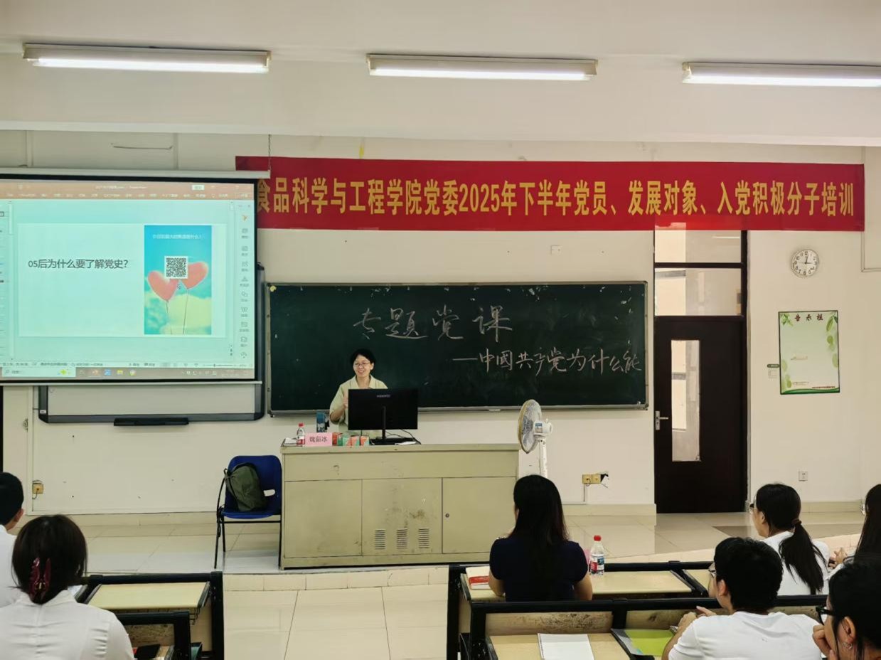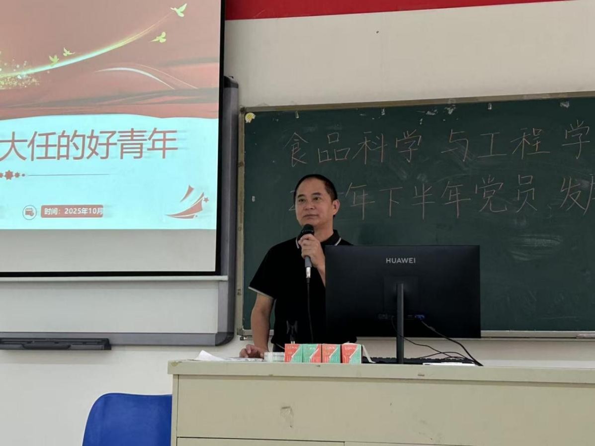10月25-26日,食品科学与和工程学院党委成功举办“铸牢理想信念,坚定使命担当”主题党日活动暨2025年下半年党员、发展对象及入党积极分子专题培训活动。部分教师党员、学生党支部全体党员、发展对象、入党积极分子参与培训,党建联合会李诗韵主持活动。