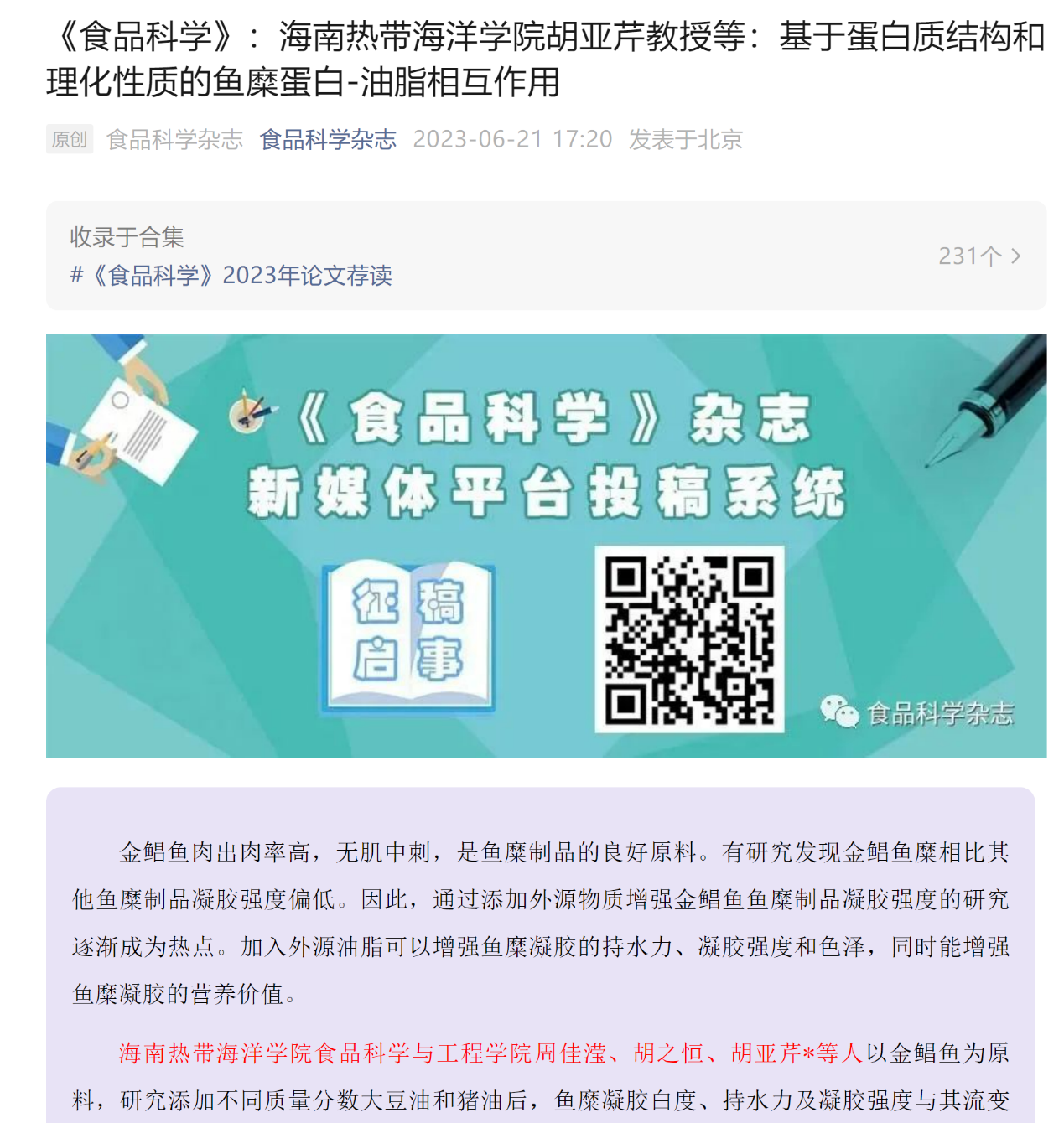 德赢官网德赢VWIN官方网站教授胡亚芹团队最新研究成果“基于蛋白质结构和理化性质的鱼糜蛋白-油脂相互作用”被国内食品领域顶级中文期刊《食品科学》录用。鉴于论文研究结果为同行评审高度认可,《食品科学》杂志作为热点文章在其官微上公开发文荐读。