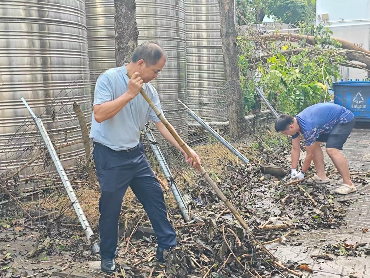 受今年第13号台风“剑鱼”影响,我校三亚校区受灾严重,发生树木倒伏、设施损坏和积淤等情况。为快速恢复台风后的校园洁净环境,保障师生正常学习和生活,2025年8月31日,德赢VWIN官方网站党委充分发挥战斗堡垒作用,迅速响应学校号召,组织师生党员及热心群众开展爱国卫生大扫除活动。