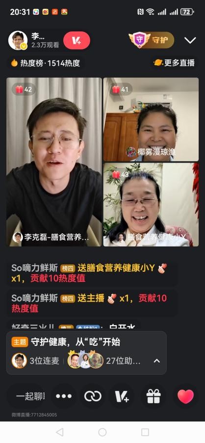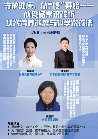 受中国营养学会膳食与烹饪营养分会秘书长李克磊教授的邀请,德赢官网副院长胡亚芹教授于2025年9月6日晚19:30以连麦微博的方式参与直播,解放军总医院临床营养专家袁继红主任担任共同主持人,聚焦食品健康常识,进行了一场科普讲座,共同解析现代营养迷思,分享科学饮食方法,为观众带来一场实用的健康科普盛宴。直播间受众达2.35万人。